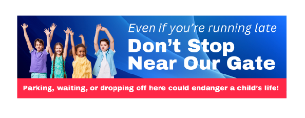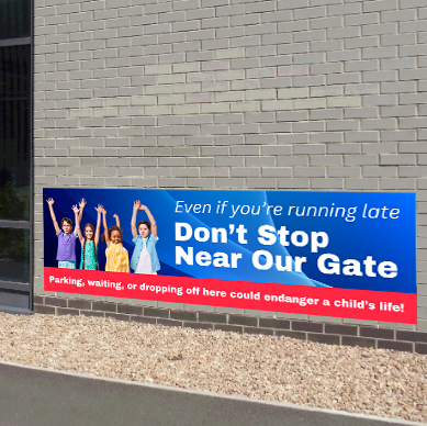 High quality PVC safety banner to encourage considerate parking by parents and visitors around the school gates.