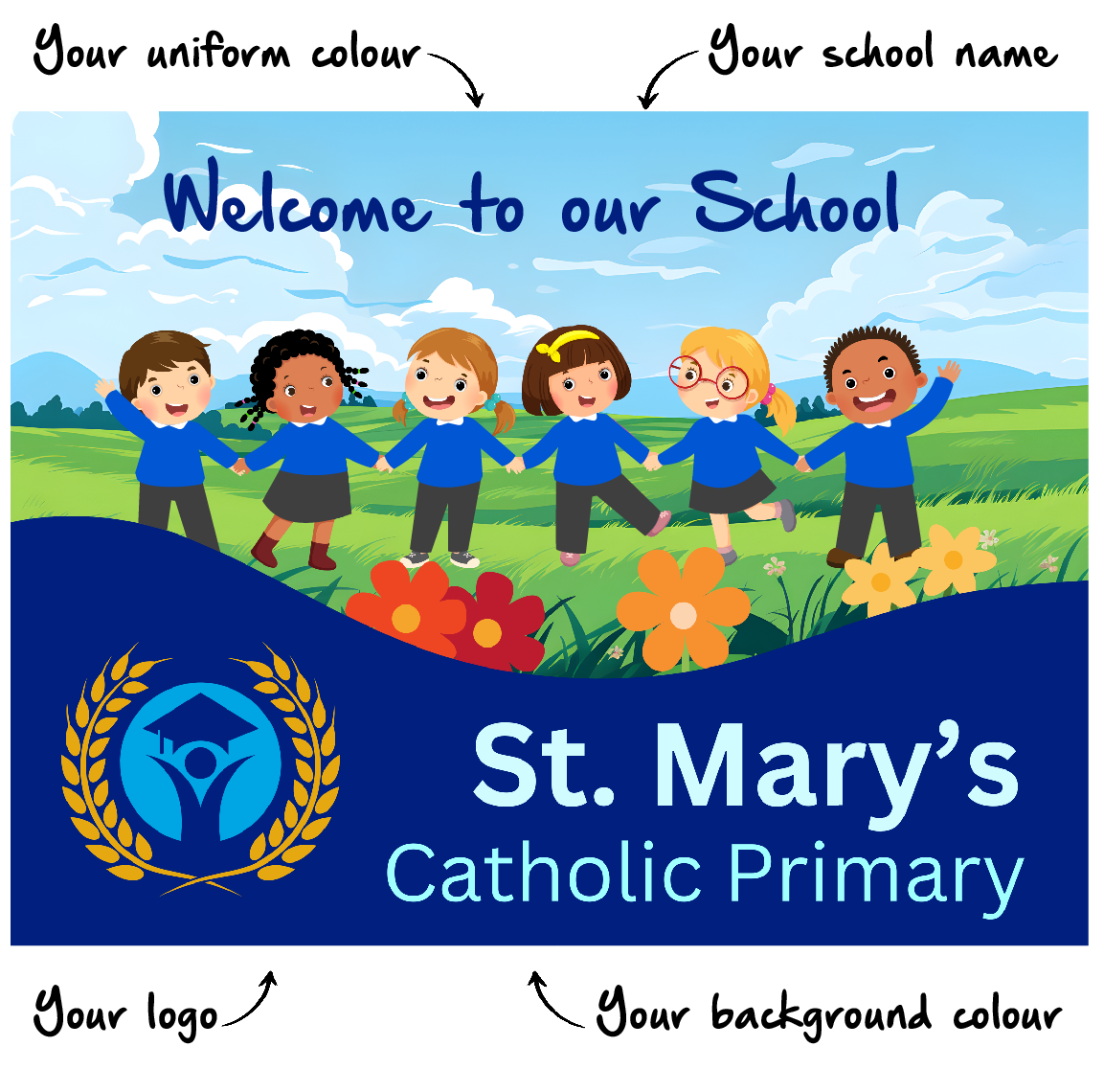 Designed to be customisable, this sign offers you the option to customise your school name, logo and banner colour to make your sign suit your requirements.